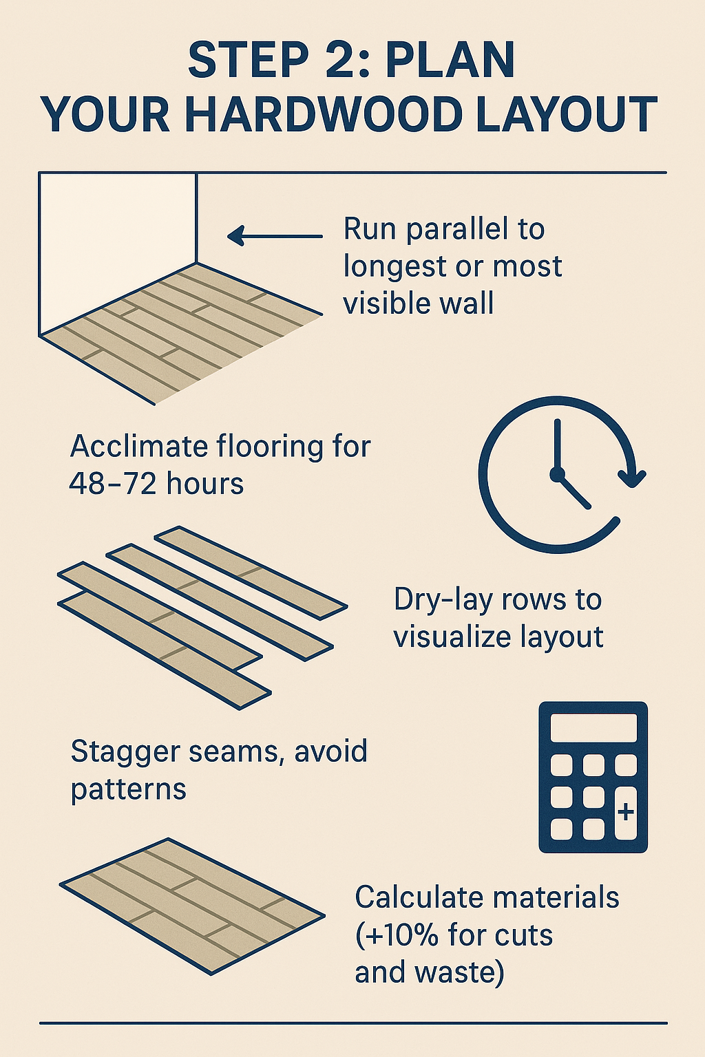 It’s usually best to lay hardwood planks parallel to the longest or main wall in a room. This helps the room feel bigger. If you’re working in several rooms, think about how planks will line up through doorways.