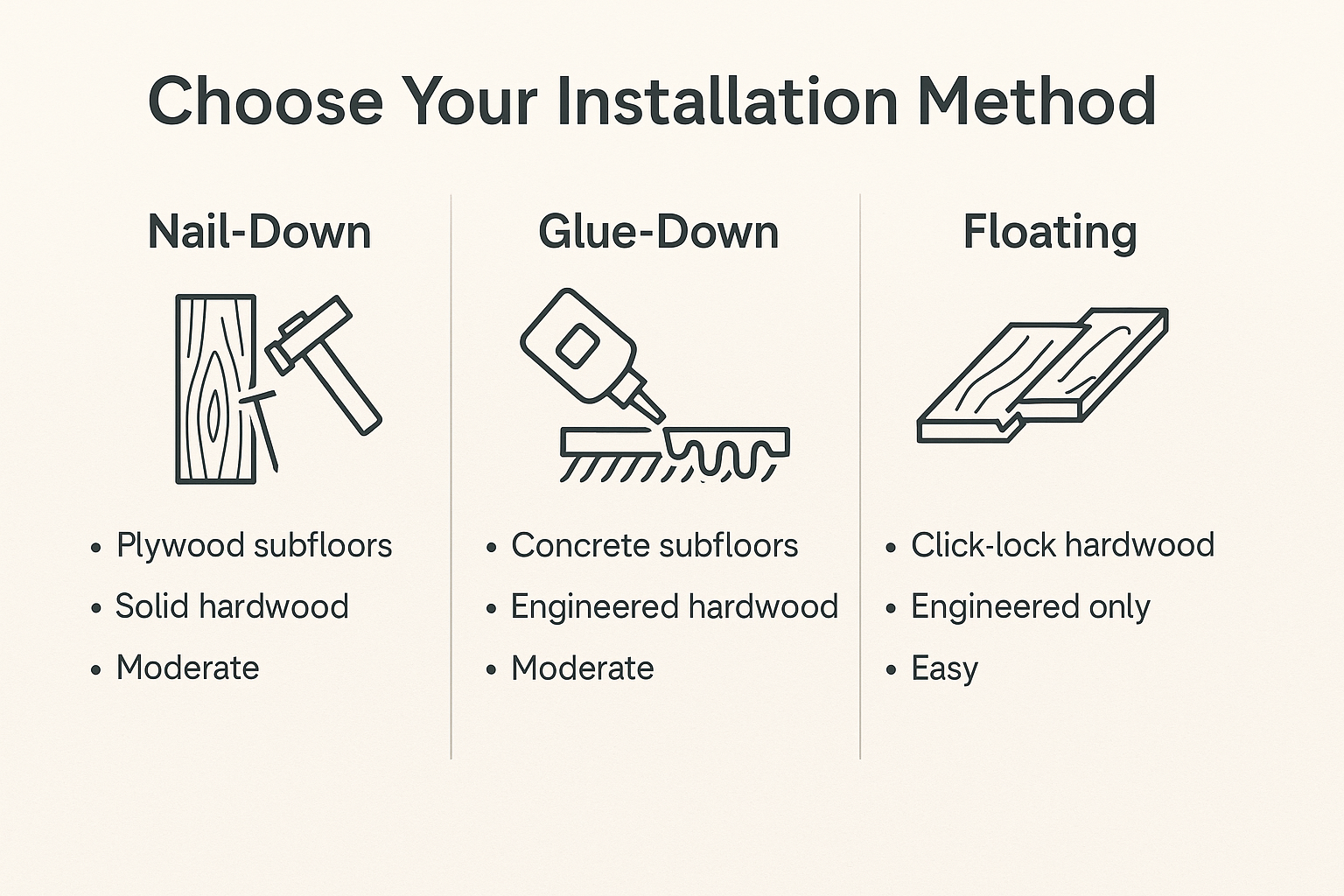 Pro Tip: For solid hardwood on wood subfloors, nail-down is often best. For engineered hardwood, floating floors are easier for DIYers.