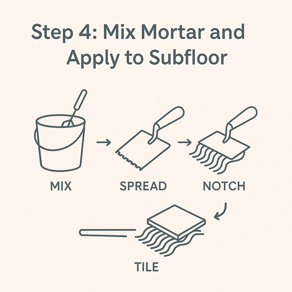 First, mix the thinset mortar as the package says. Use a clean bucket and a drill with a mixing paddle to make it smooth and without lumps. Let it sit for a few minutes, then mix again before using.