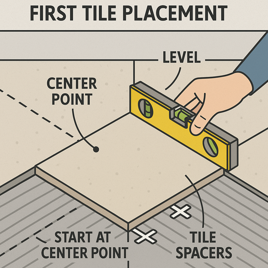 Use chalk lines from your planning to start at the center of the room or a main point. This helps spread tiles evenly.